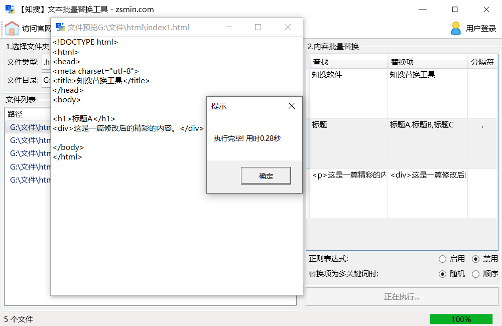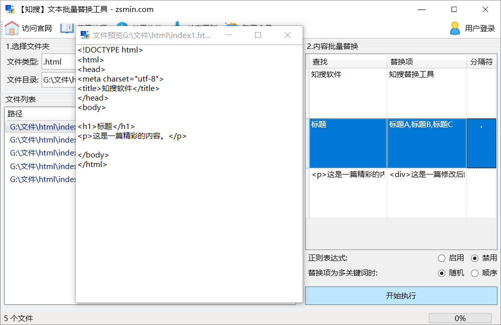 2.【随机替换】:可将选中的所有HTML文档中的内容A分别替换成内容B、内容C、内容D等 不同内容。